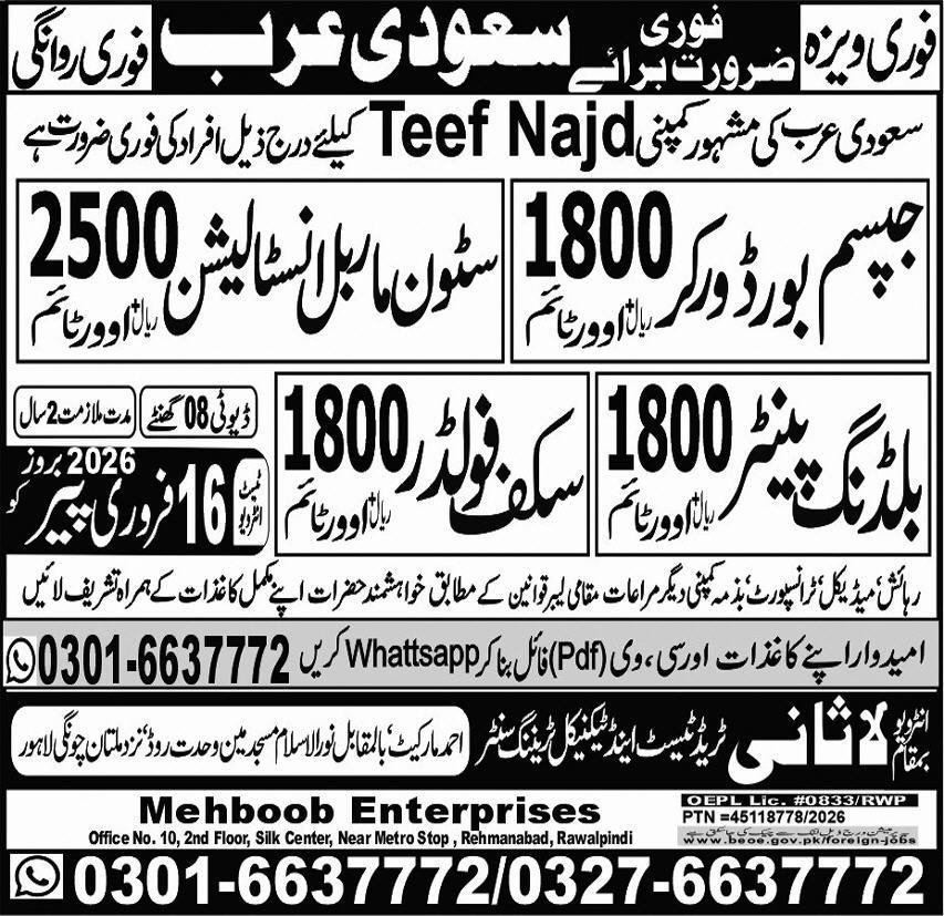 Stone Marble Installation & Scaffolder Jobs 2026 announce the Contract career opportunities for the post of See Below Ad in Saudi Arabia for the fresh and experienced candidates on Contract basis who have Check Advertisement degree. Posted date of this post is 11/02/2026 and the last date is 16/02/2026. if you are eligible for this job apply before due date.