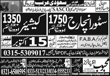 Store Incharge And Cashir Jobs in Saudia Arabia 2025 announce the Contract career opportunities for the post of See Below Ad in Saudi Arabia for the fresh and experienced candidates on Contract basis who have Check Advertisement degree. Posted date of this post is 12/10/2025 and the last date is 15/10/2025. if you are eligible for this job apply before due date.
