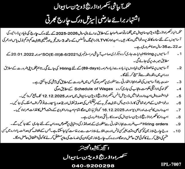 The Irrigation Department, Sukkur Oorange Division Sahiwal, requires applications on plain paper for driver positions on a work-charge basis for the financial year 2025-2026 according to departmental rules and regulations. Candidates must have an LTV driving license with 3 years of experience, minimum middle pass education, and age limit 22 to 35 years.