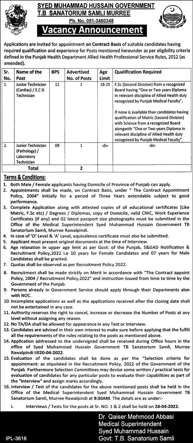 Syed Muhammad Hussain Government TB Sanatorium Jobs announce the Contract career opportunities for the post of See Below Ad in Punjab, Rawalpindi for the fresh and experienced candidates on Contract basis who have Check Advertisement degree. Posted date of this post is 06/04/2022 and the last date is 20/04/2022. if you are eligible for this job apply before due date.