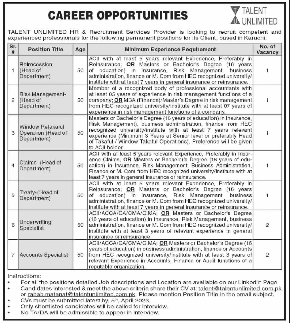 - Talent Unlimited is looking for candidates for following posts as per job advertisement published in daily Dawn Newspaper of March 21, 2023 for location Karachi, karachi Sindh Pakistan: accounts specialist,head of department treaty,head of department window retakaful operation,head of department claims,retrocession head of department,underwriting specialist and head of department risk management