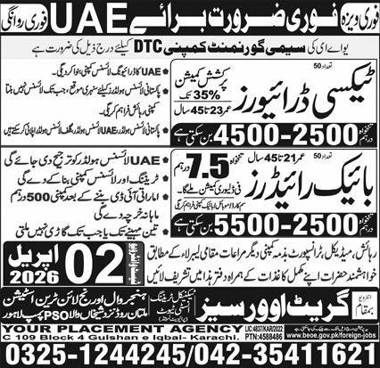 Taxi Driver and Bike Ride Jobs in United Arab Emirates UAE announce the Contract career opportunities for the post of See Below Ad in United Arab Emirates for the fresh and experienced candidates on Contract basis who have Check Advertisement degree. Posted date of this post is 29/03/2026 and the last date is 02/04/2026. if you are eligible for this job apply before due date.