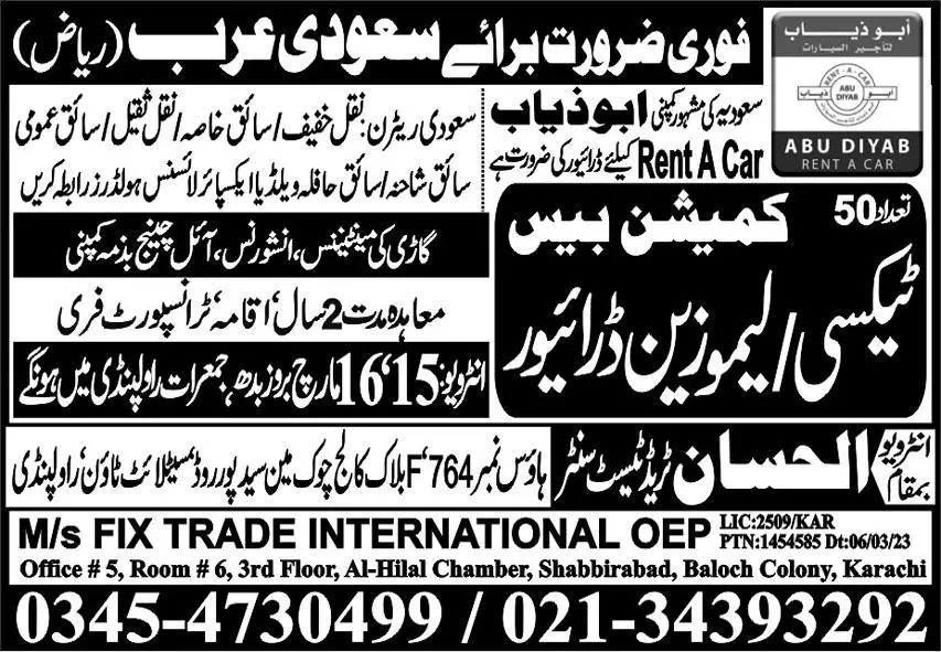 Taxi Driver Jobs in Saudi Arabia 2023 announce the Contract career opportunities for the post of See Below Ad in Saudi Arabia for the fresh and experienced candidates on Contract basis who have Check Advertisement degree. Posted date of this post is 12/03/2023 and the last date is 16/03/2023. if you are eligible for this job apply before due date.