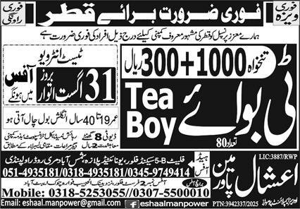 Tea Boy Jobs Career Opportunity In Qatar 2025 announce the Contract career opportunities for the post of See Below Ad in Qatar for the fresh and experienced candidates on Contract basis who have Check Advertisement degree. Posted date of this post is 30/08/2025 and the last date is 31/08/2025. if you are eligible for this job apply before due date.
