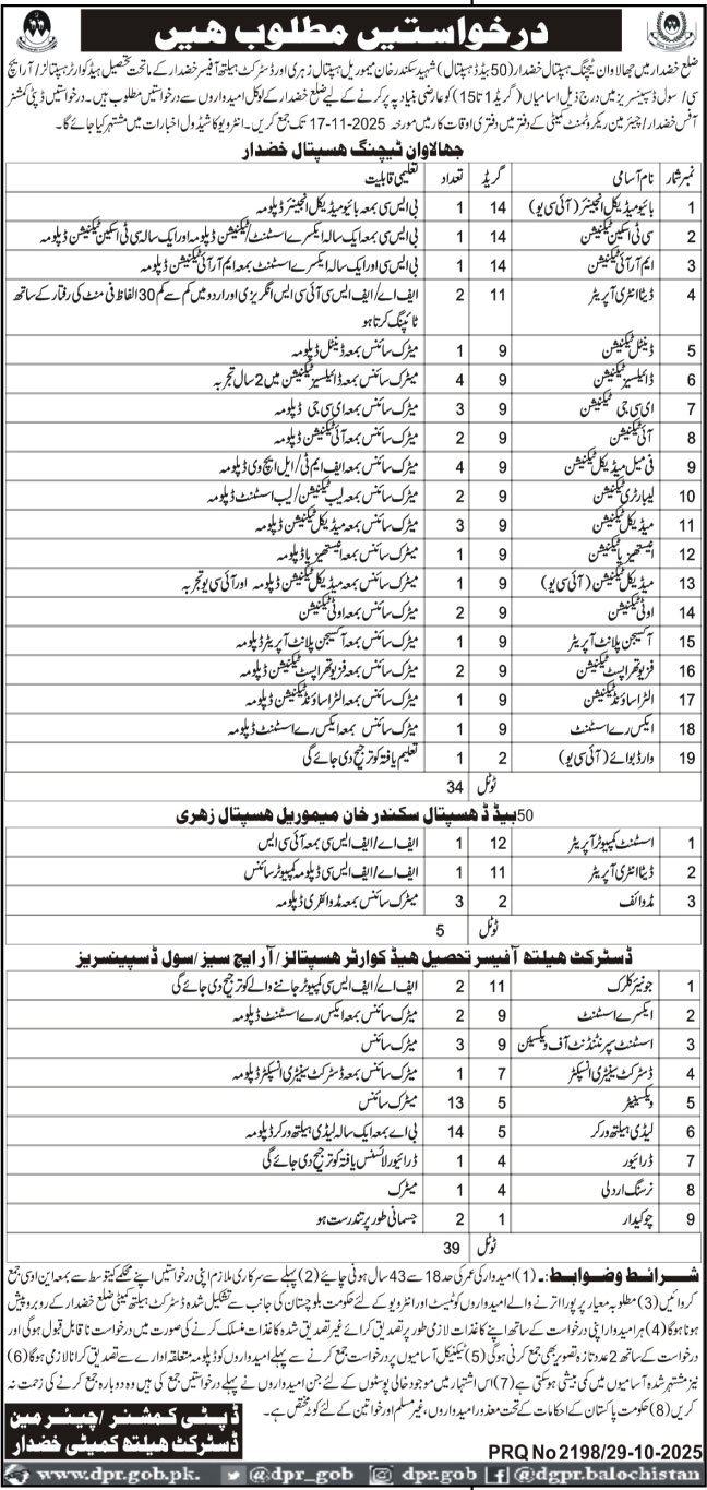 Applications are required from local candidates of Khuzdar district to fill the following vacancies on a temporary basis for grades 1 to 15 in Jhalawan Teaching Hospital Khuzdar (50-bed hospital), Shaheed Sikandar Khan Memorial Hospital Zohri, and Tehsil Headquarters Hospitals/R.H.C.s/Civil Dispensaries under the District Health Officer, Khuzdar. Applications must be submitted to the office of the Recruitment Committee at the D.C. Office, Khuzdar, during office hours by November 17, 2025. The interview schedule will be advertised in newspapers.