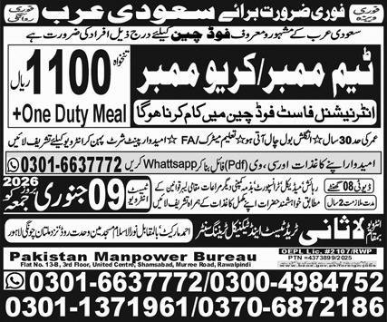 Team Member And Crew Member Jobs in Saudia Arabia 2026 announce the Contract career opportunities for the post of See Below Ad in Saudi Arabia for the fresh and experienced candidates on Contract basis who have Check Advertisement degree. Posted date of this post is 27/12/2025 and the last date is 09/01/2026. if you are eligible for this job apply before due date.