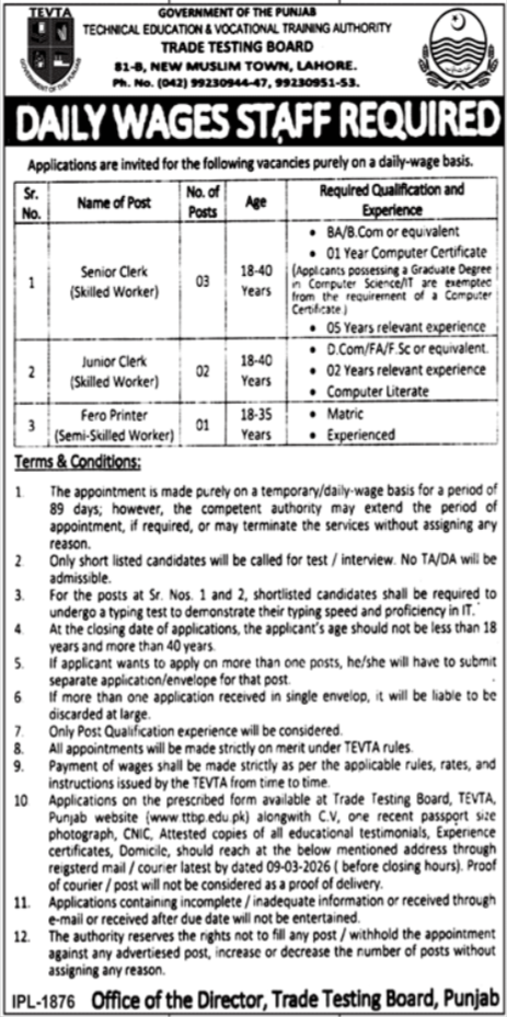 - Applications on the prescribed form available at Trade Testing Board, TEVTA, Punjab website alongwith C.V, one recent passport size photograph, CNIC, Attested copies of all educational testimonials, Experience certificates, Domicile, should reach at the below mentioned address through registered mail/courier latest by dated 09-03-2026 (before closing hours). Proof of courier/post will not be considered as a proof of delivery.