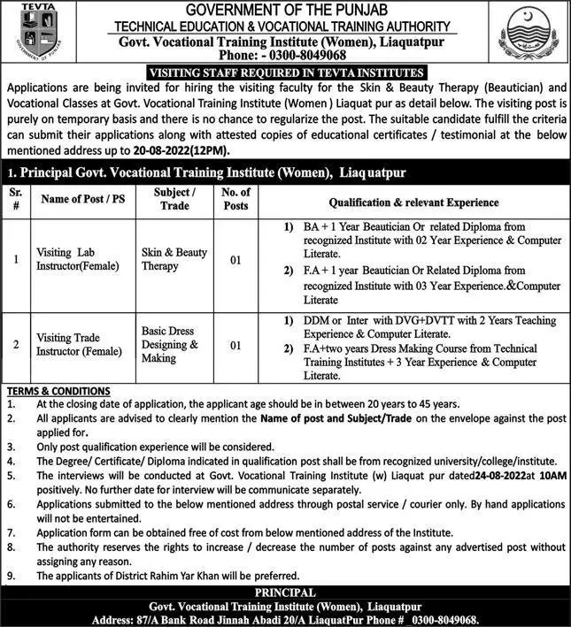 - Govt Vocational Training Institute for Women Liaquatpur, Technical Education & Vocational Training Authority TEVTA Rahim Yar Khan, rahim yar khan Punjab Pakistan invites applications from eligible candidates for the post of visiting trade instructor and visiting lab instructor as per advertisement of August 7, 2022 published in daily Express Newspaper. Bachelor, Others, Intermediate and BA etc. educational qualification will be preferred.