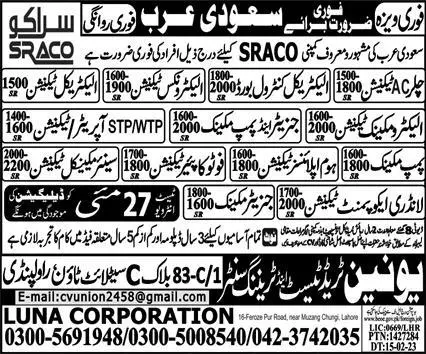 Technical Staff Jobs In Sraco Company Saudi Arabia announce the Contract career opportunities for the post of See Below Ad in Saudi Arabia for the fresh and experienced candidates on Contract basis who have Check Advertisement degree. Posted date of this post is 25/05/2023 and the last date is 27/05/2023. if you are eligible for this job apply before due date.