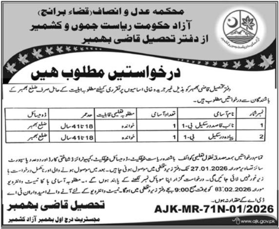 Applications are required from residents of Bhimber district only, who possess the required qualifications for the following non-gazetted vacant posts in the office of the Tehsildar Qazi Bhimber.