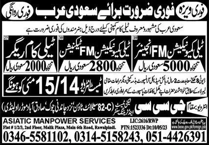 Telecom Rigger & Telecommunication FM Technician Jobs 2023 announce the Contract career opportunities for the post of See Below Ad in Saudi Arabia for the fresh and experienced candidates on Contract basis who have Check Advertisement degree. Posted date of this post is 12/05/2023 and the last date is 15/05/2023. if you are eligible for this job apply before due date.