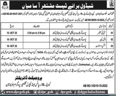 Test Schedule Covid-19 Response & Natural Calamities Program announce the Contract career opportunities for the post of See Below Ad in Balochistan, Quetta for the fresh and experienced candidates on Contract basis who have Check Advertisement degree. Posted date of this post is 11/10/2022 and the last date is 16/10/2022. if you are eligible for this job apply before due date.