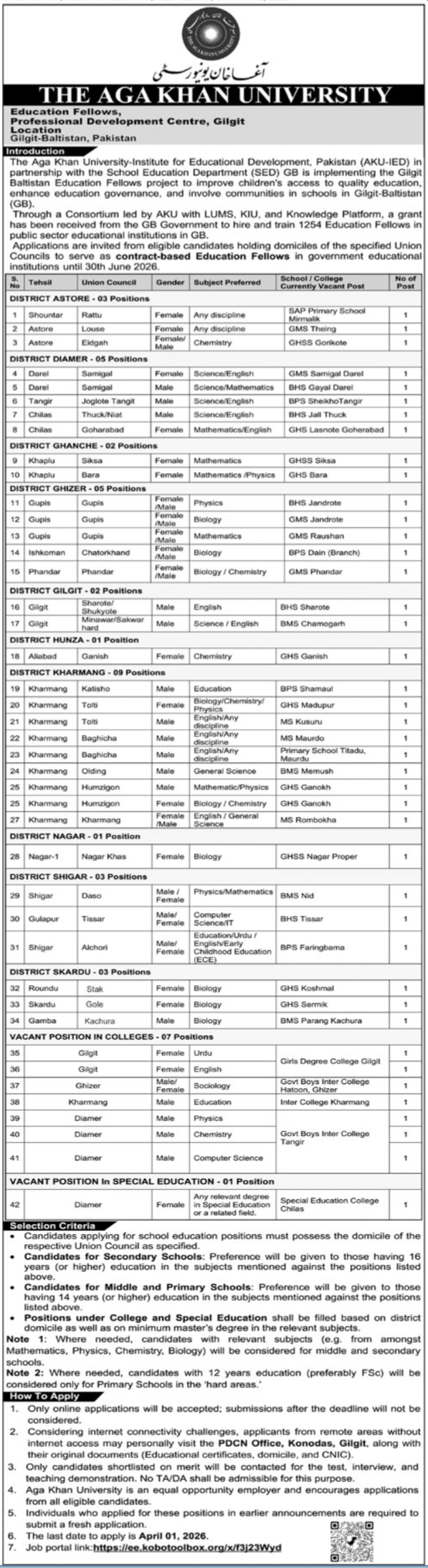 The Aga Khan University AKU Gilgit Jobs 2026 announce the Contract career opportunities for the post of See Below Ad in Gilgit Baltistan, Gilgit for the fresh and experienced candidates on Contract basis who have Check Advertisement degree. Posted date of this post is 18/03/2026 and the last date is 01/04/2026. if you are eligible for this job apply before due date.