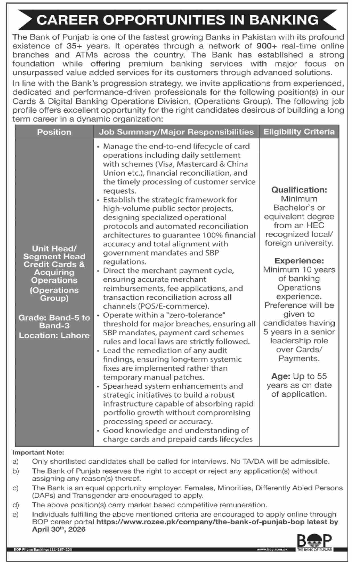 The Bank Of Punjab BOP Lahore Job 2026 announce the Contract career opportunities for the post of See Below Ad in Punjab, Lahore for the fresh and experienced candidates on Contract basis who have Check Advertisement degree. Posted date of this post is 16/04/2026 and the last date is 30/04/2026. if you are eligible for this job apply before due date.