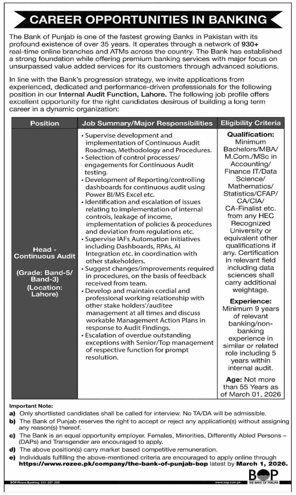 The Bank of Punjab BOP Lahore Jobs 2026 announce the Contract career opportunities for the post of See Below Ad in Punjab, Lahore for the fresh and experienced candidates on Contract basis who have Check Advertisement degree. Posted date of this post is 15/02/2026 and the last date is 01/03/2026. if you are eligible for this job apply before due date.