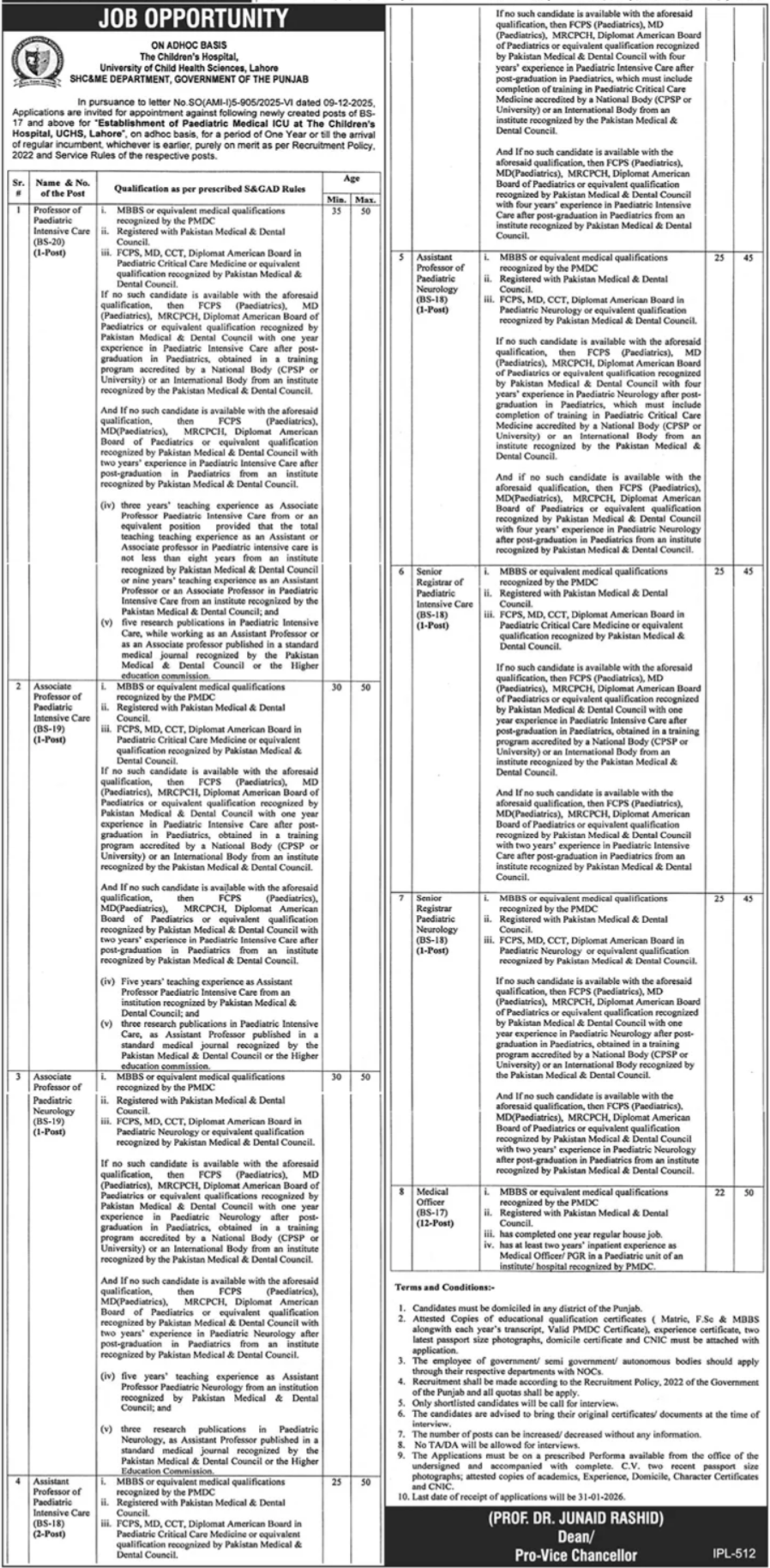 The Children Hospital Lahore Jobs 2026 For Professors announce the Contract career opportunities for the post of See Below Ad in Punjab, Lahore for the fresh and experienced candidates on Contract basis who have Check Advertisement degree. Posted date of this post is 15/01/2026 and the last date is 31/01/2026. if you are eligible for this job apply before due date.