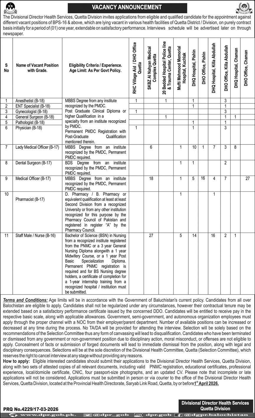 How to apply: Eligible interested candidates should submit their applications to the Divisional Director Health Services, Quetta Division, along with two sets of attested copies of all relevant documents, including valid PNMC registration, educational certificates, professional experience, local/domicile certificate, CNIC, four passport-size photographs, and an updated CV. Please note that incomplete or late applications will not be considered. Applications must be submitted in person or via courier to the office of the Divisional Director Health Services, Quetta Division, located at the Provincial Health Directorate, Saryab Link Road, Quetta, by or before 1st April 2026.