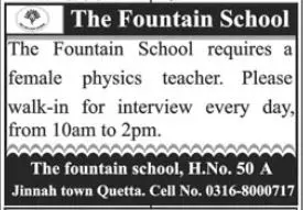 - every day,The fountain school, H.No. 50 AJinnah town Quetta. Cell No. 0316-8000717