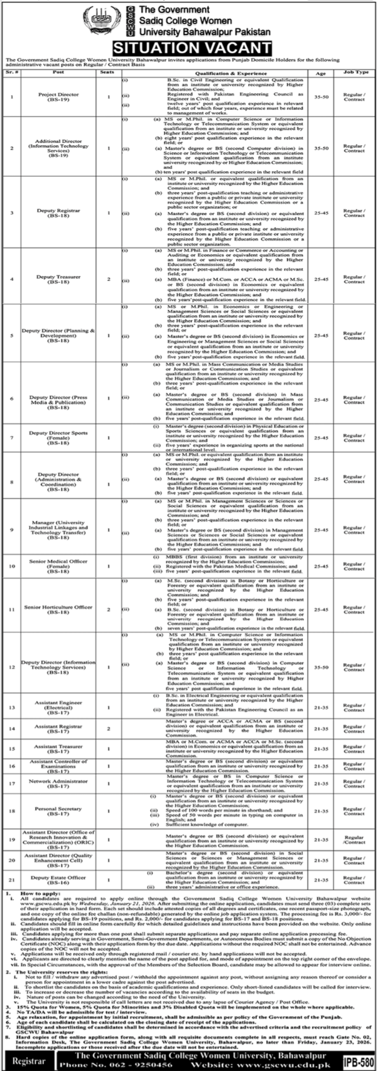 • All posts are offered on purely regular basis, with all requisite documents complete in all respects, must reach the Registrar's Office, the Government Sadiq College Women University Bahawalpur on or before the closing date: 24.11.2025