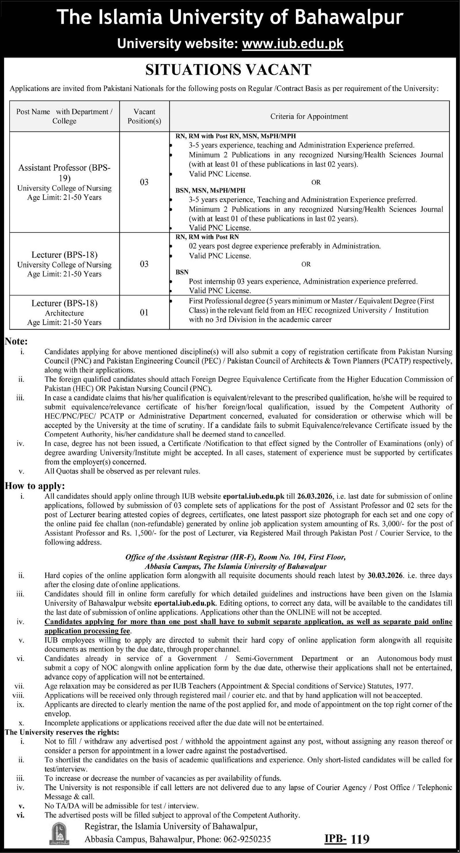 The Islamia University Of Bahawalpur Jobs 2026 announce the Contract career opportunities for the post of See Below Ad in Punjab, Bahawalpur for the fresh and experienced candidates on Contract basis who have Check Advertisement degree. Posted date of this post is 24/02/2026 and the last date is 11/03/2026. if you are eligible for this job apply before due date.