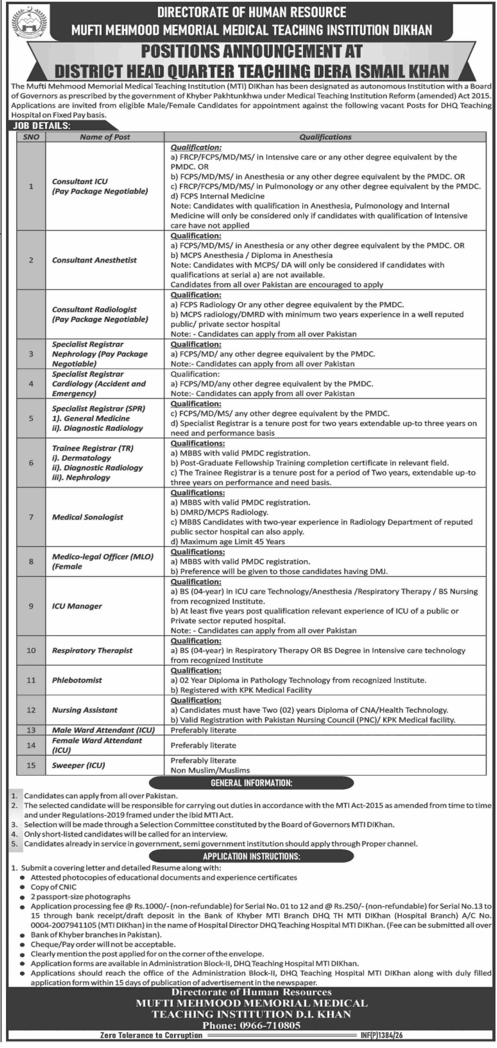 The Mufti Mehmood Memorial Medical Teaching Institution (MTI) DI Khan has been designated as an autonomous institution with a Board of Governors as prescribed by the government of Khyber Pakhtunkhwa under the Medical Teaching Institution Reform (amended) Act 2015. Applications are invited from eligible Male/Female candidates for appointment against the following vacant posts for DHQ Teaching Hospital on Fixed Pay basis.