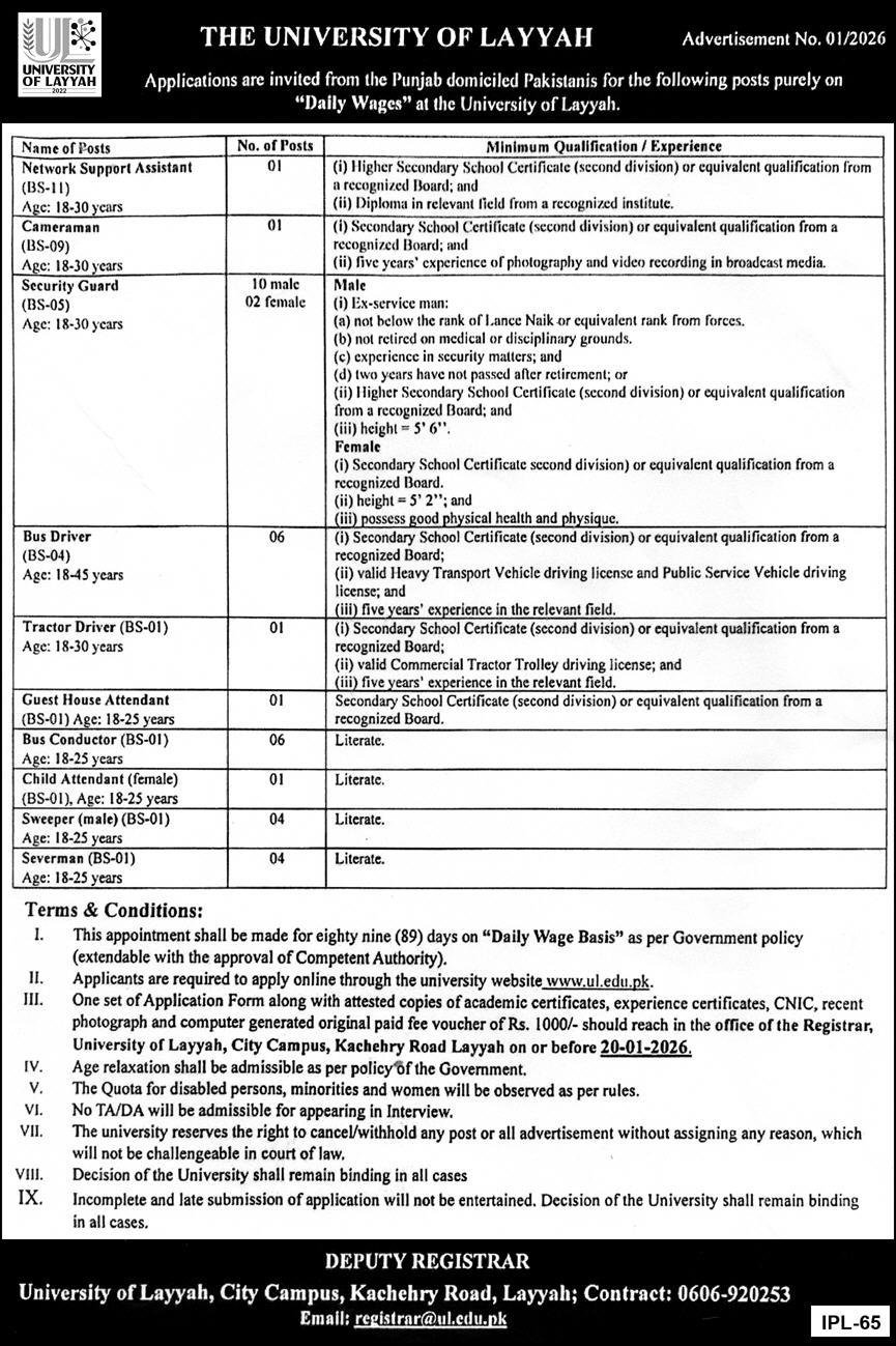 Applications are invited from the Punjab domiciled Pakistanis for the following posts purely on "Daily Wages" at the University of Layyah.