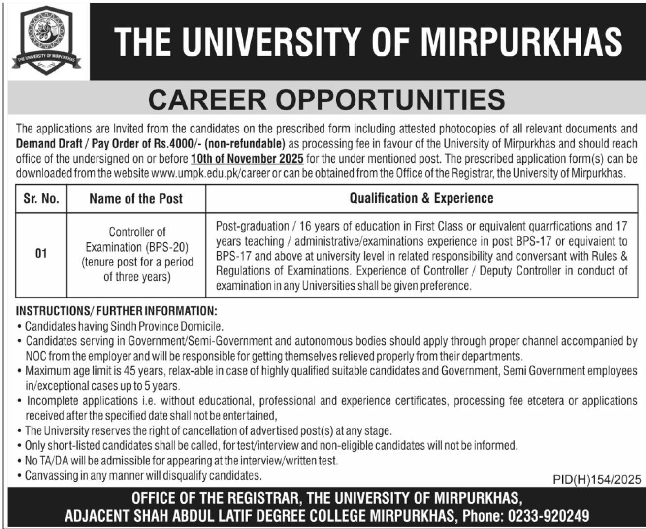 The applications are invited from the candidates on the prescribed form including attested photocopies of all relevant documents and Demand Draft/Pay Order of Rs. 4000/- (non-refundable) as processing fee in favour of the University of Mirpurkhas and should reach office of the undersigned on or before 10th of November 2025 for the under mentioned post. The prescribed application form(s) can be downloaded from the website www.umpk.edu.pk/career or can be obtained from the Office of the Registrar, the University of Mirpurkhas.