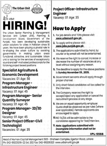 The Urban Unit Punjab Lahore Jobs 2025 announce the Contract career opportunities for the post of See Below Ad in Punjab, Lahore for the fresh and experienced candidates on Contract basis who have Check Advertisement degree. Posted date of this post is 29/10/2025 and the last date is 09/11/2025. if you are eligible for this job apply before due date.