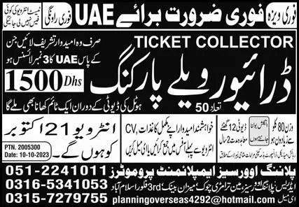 Ticket Collector & Driver Valet Parking Jobs 2023 In UAE announce the Contract career opportunities for the post of See Below Ad in United Arab Emirates for the fresh and experienced candidates on Contract basis who have Check Advertisement degree. Posted date of this post is 18/10/2023 and the last date is 21/10/2023. if you are eligible for this job apply before due date.