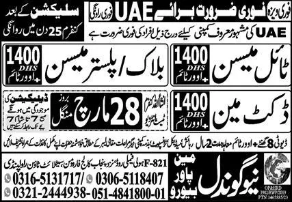 Tile Mason and Plaster Mason Jobs 2023 in UAE announce the Contract career opportunities for the post of See Below Ad in United Arab Emirates for the fresh and experienced candidates on Contract basis who have Check Advertisement degree. Posted date of this post is 26/03/2023 and the last date is 29/03/2023. if you are eligible for this job apply before due date.