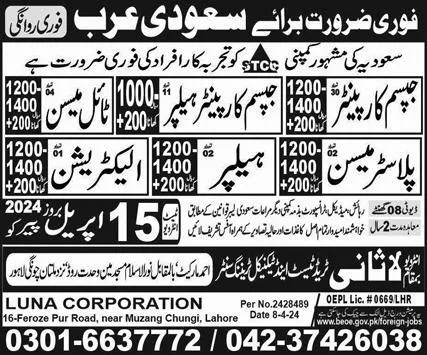 Tile Mason And Plaster Mason Jobs in Saudia Arabia 2024 announce the Contract career opportunities for the post of See Below Ad in Saudi Arabia for the fresh and experienced candidates on Contract basis who have Check Advertisement degree. Posted date of this post is 14/04/2024 and the last date is 15/04/2024. if you are eligible for this job apply before due date.