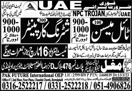 Tile Mason and Shuttering Carpenter jobs in UAE 2023 announce the Contract career opportunities for the post of See Below Ad in Abu Dhabi for the fresh and experienced candidates on Contract basis who have Check Advertisement degree. Posted date of this post is 14/03/2023 and the last date is 16/03/2023. if you are eligible for this job apply before due date.