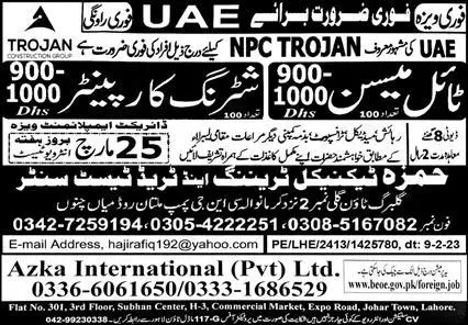 Tile Mason and Shuttering Carpenter jobs in UAE 2023 announce the Contract career opportunities for the post of See Below Ad in United Arab Emirates for the fresh and experienced candidates on Contract basis who have Check Advertisement degree. Posted date of this post is 21/03/2023 and the last date is 25/03/2023. if you are eligible for this job apply before due date.