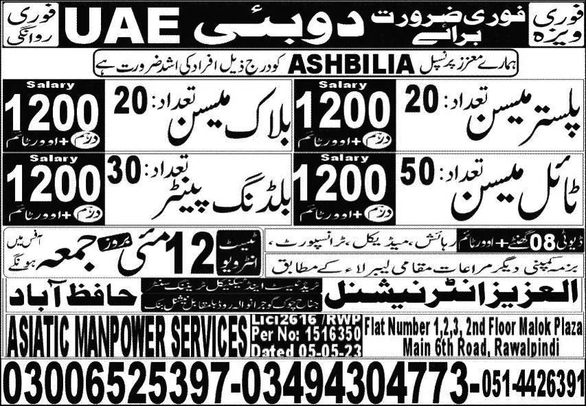 Tile Mason & Building Painter Jobs 2023 In Dubai 2023 announce the Contract career opportunities for the post of See Below Ad in Dubai for the fresh and experienced candidates on Contract basis who have Check Advertisement degree. Posted date of this post is 09/05/2023 and the last date is 12/05/2023. if you are eligible for this job apply before due date.