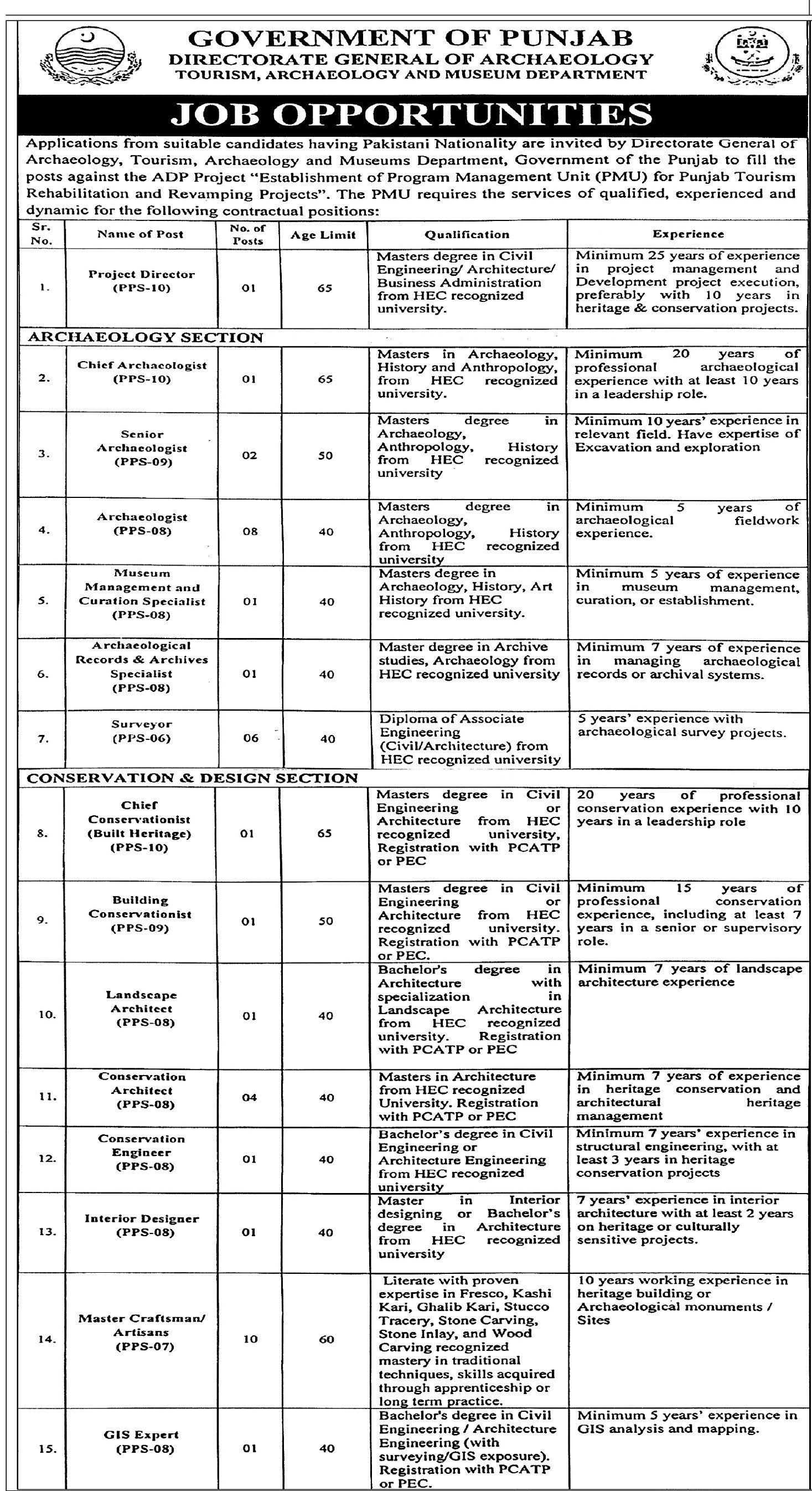 Applications from suitable candidates having Pakistani Nationality are invited by Directorate General of Archaeology, Tourism, Archaeology and Museums Department, Government of the Punjab to fill the posts against the ADP Project "Establishment of Program Management Unit (PMU) for Punjab Tourism Rehabilitation and Revamping Projects". The PMU requires the services of qualified, experienced and dynamic for the following contractual positions: