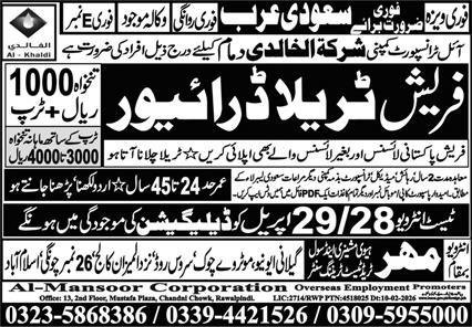 Traila Driver & HTV Driver Jobs 2026 In Saudi Arabia announce the Contract career opportunities for the post of See Below Ad in Saudi Arabia for the fresh and experienced candidates on Contract basis who have Check Advertisement degree. Posted date of this post is 28/04/2026 and the last date is 29/04/2026. if you are eligible for this job apply before due date.