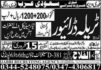Traila Driver Jobs 2024 In Saudi Arabia announce the Contract career opportunities for the post of See Below Ad in Saudi Arabia for the fresh and experienced candidates on Contract basis who have Check Advertisement degree. Posted date of this post is 04/02/2024 and the last date is 15/02/2024. if you are eligible for this job apply before due date.