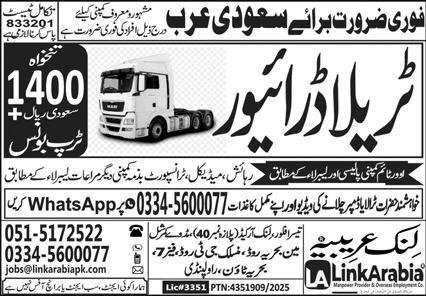 Trala Driver Jobs in Saudia Arabia 2025 announce the Contract career opportunities for the post of See Below Ad in Saudi Arabia for the fresh and experienced candidates on Contract basis who have Check Advertisement degree. Posted date of this post is 17/12/2025 and the last date is 26/12/2025. if you are eligible for this job apply before due date.