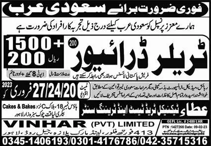 - Vinhar Pvt Limited is looking for candidates for following posts as per job advertisement published in daily Express Newspaper of February 26, 2023 for location Saudi Arabia, saudi arabia Saudi Arabia: