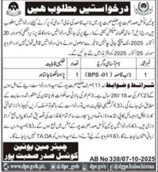 Applications are required to fill the vacant post of Naib Qasid in Union Council Sadr Mohabbat Pur, Sohbatpur District. The above-mentioned vacancy will be filled through a selection committee. Applications on plain paper should be submitted by 20 October 2025. Applications received late will not be accepted and interviews will be held on 25 October 2025 in this office.