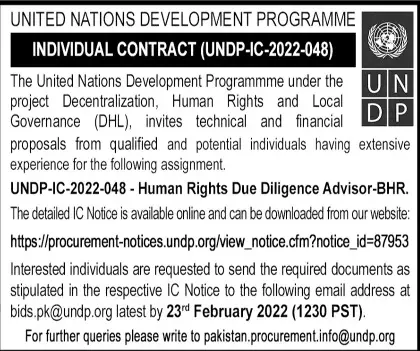 United Nations Development Program (UNDP) Jobs announce the Contract career opportunities for the post of See Below Ad in Pakistan for the fresh and experienced candidates on Contract basis who have Check Advertisement degree. Posted date of this post is 11/02/2022 and the last date is 23/02/2022. if you are eligible for this job apply before due date.