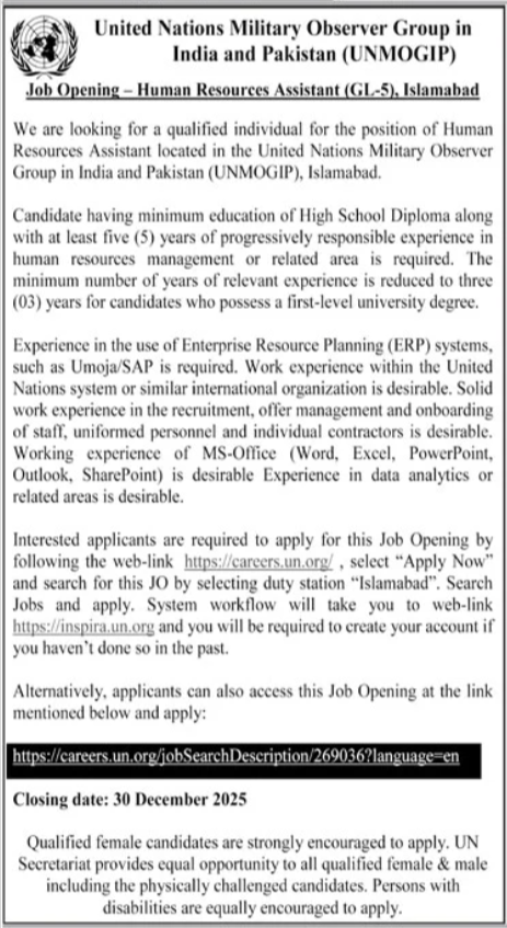 We are looking for a qualified individual for the position of Human Resources Assistant located in the United Nations Military Observer Group in India and Pakistan (UNMOGIP), Islamabad.