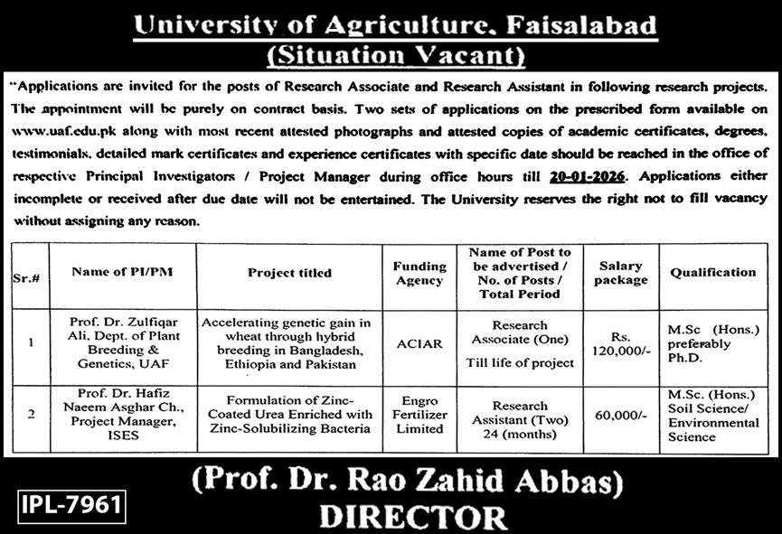 University Of Agriculture Faisalabad UAF Jobs 2026 announce the Contract career opportunities for the post of See Below Ad in Punjab, Faisalabad for the fresh and experienced candidates on Contract basis who have Check Advertisement degree. Posted date of this post is 27/12/2025 and the last date is 20/01/2026. if you are eligible for this job apply before due date.