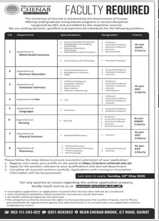 University of Chenab Punjab Jobs 2026 announce the Contract career opportunities for the post of See Below Ad in Punjab for the fresh and experienced candidates on Contract basis who have Check Advertisement degree. Posted date of this post is 26/04/2026 and the last date is 10/05/2026. if you are eligible for this job apply before due date.