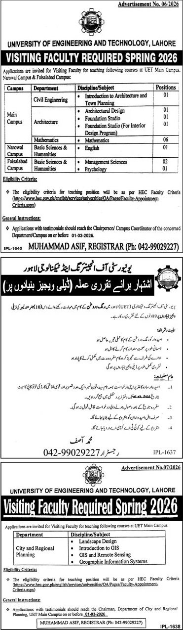 University of Engineering And Technology Lahore Jobs 2026 announce the Contract career opportunities for the post of See Below Ad in Punjab, Lahore for the fresh and experienced candidates on Contract basis who have Check Advertisement degree. Posted date of this post is 15/02/2026 and the last date is 01/03/2026. if you are eligible for this job apply before due date.