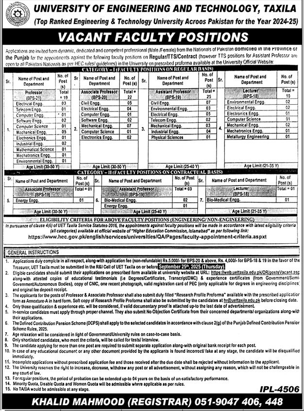 university of Engineering And Technology Taxila Jobs 2025 announce the Contract career opportunities for the post of See Below Ad in Punjab for the fresh and experienced candidates on Contract basis who have Check Advertisement degree. Posted date of this post is 08/09/2025 and the last date is 25/09/2025. if you are eligible for this job apply before due date.