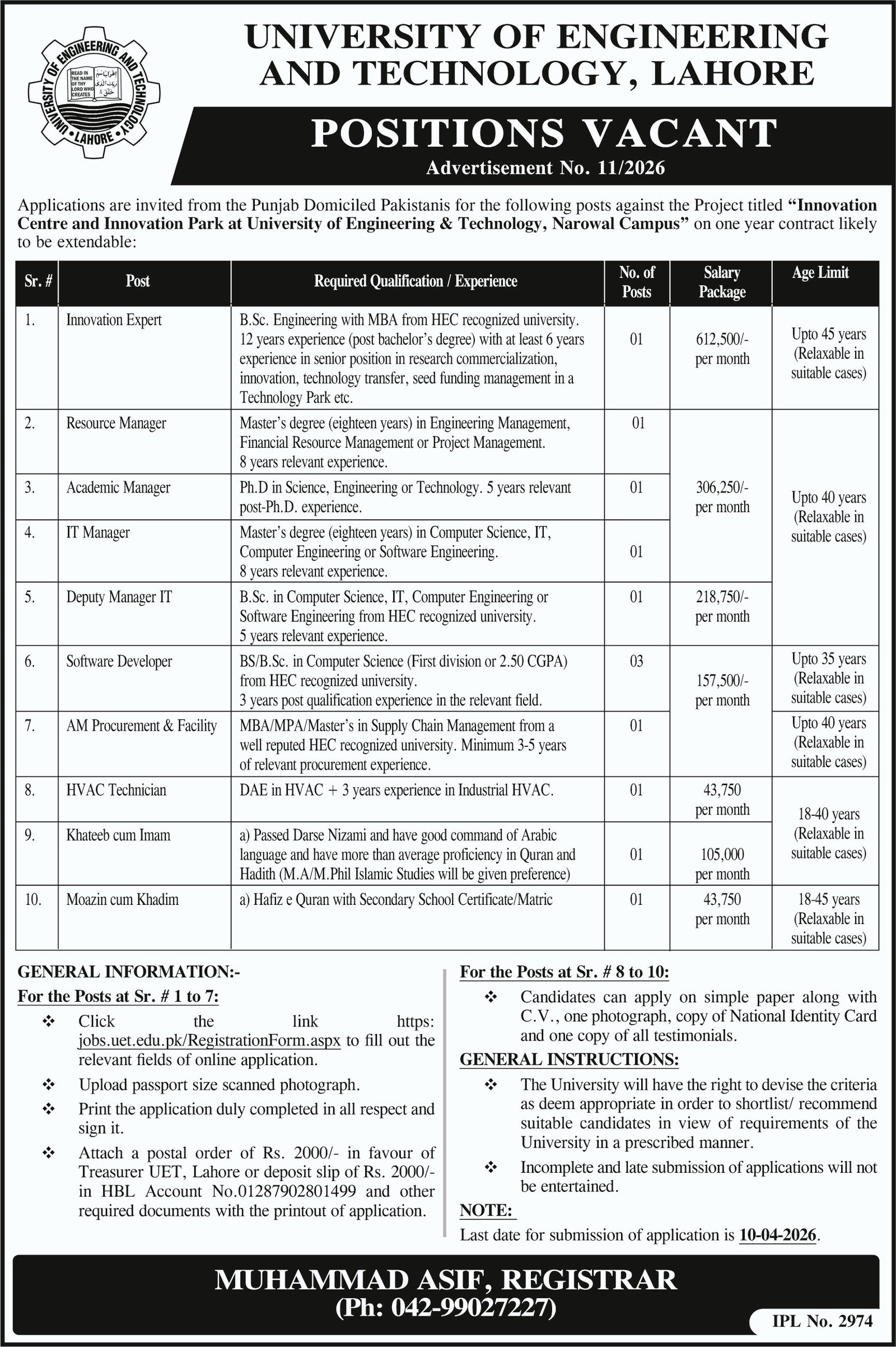 University Of Engineering And Technology UET Lahore Jobs announce the Contract career opportunities for the post of See Below Ad in Punjab, Lahore for the fresh and experienced candidates on Contract basis who have Check Advertisement degree. Posted date of this post is 26/03/2026 and the last date is 15/04/2026. if you are eligible for this job apply before due date.