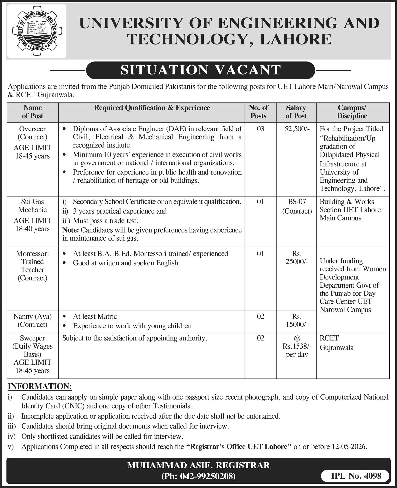 University Of Engineering & Technology UET Lahore Jobs 2026 announce the Contract career opportunities for the post of See Below Ad in Punjab, Lahore for the fresh and experienced candidates on Contract basis who have Check Advertisement degree. Posted date of this post is 28/04/2026 and the last date is 12/05/2026. if you are eligible for this job apply before due date.