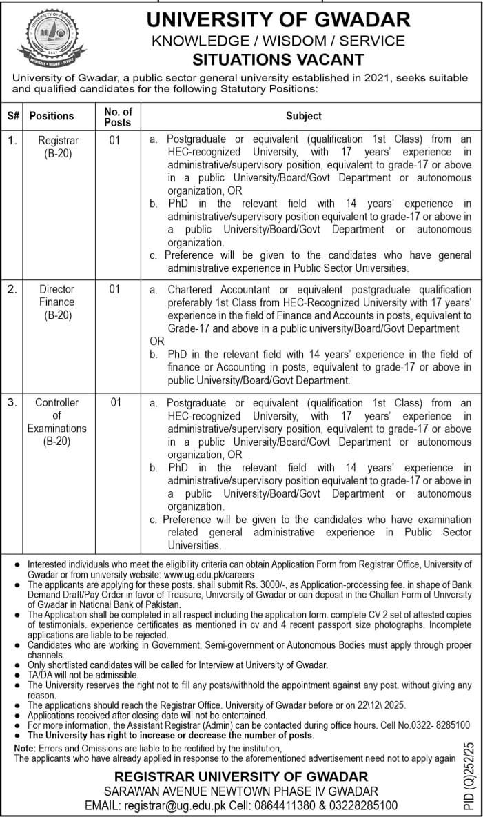 University of Gwadar Balochistan Jobs 2025 announce the Contract career opportunities for the post of See Below Ad in Balochistan, Gwadar for the fresh and experienced candidates on Contract basis who have Check Advertisement degree. Posted date of this post is 07/12/2025 and the last date is 22/12/2025. if you are eligible for this job apply before due date.