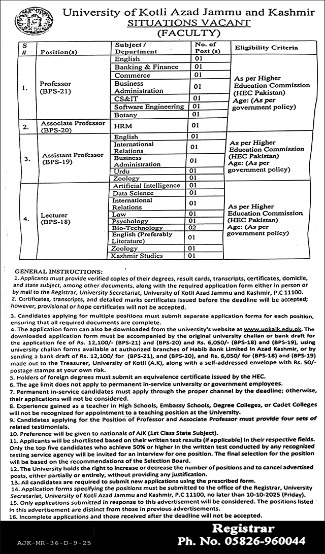 University Of Kotli Jobs 2025 announce the Contract career opportunities for the post of See Below Ad in Azad Jammu Kashmir, Kotli for the fresh and experienced candidates on Contract basis who have Check Advertisement degree. Posted date of this post is 19/09/2025 and the last date is 10/10/2025. if you are eligible for this job apply before due date.